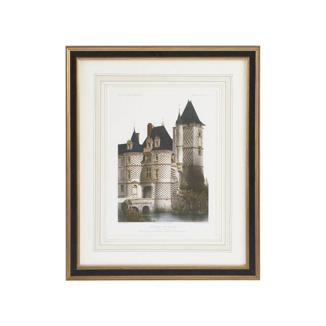 Lithograph print, black and gold frame with french mat under glass