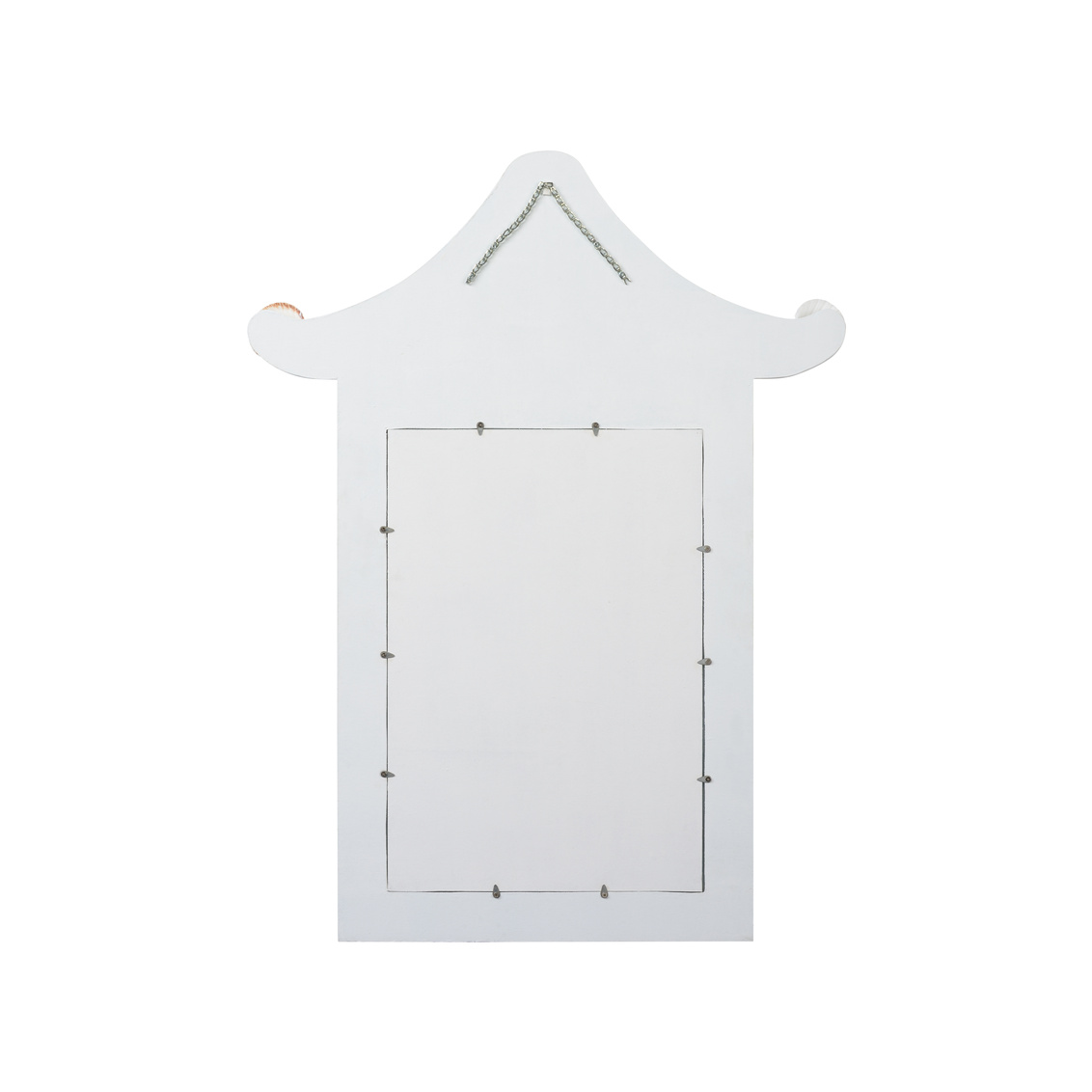 Inspired by the graceful lines of traditional pagoda architecture, this mirror is artfully constructed from natural shell, creating a luminous surface with subtle iridescence. Its tiered silhouette and intricate detailing evoke a sense of timeless elegance, blending coastal charm with classic Asian design influences.