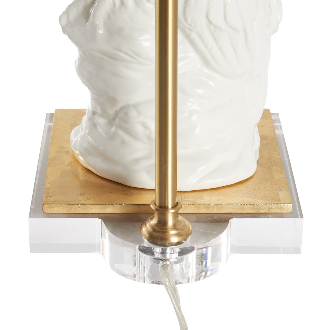 This handsome ceramic owl lamp features intricate detailing and a charming design, with gold accents adding a touch of elegance. Set on a clear base, it blends playfulness with sophistication for a unique statement piece. Designed by Shayla Copas.