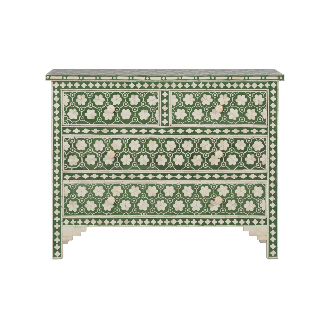 A timeless classic, this lovely green and off-white inlaid chest features a refined floral pattern and four spacious drawers. Its elegant silhouette and intricate craftsmanship make it a standout piece for any room.