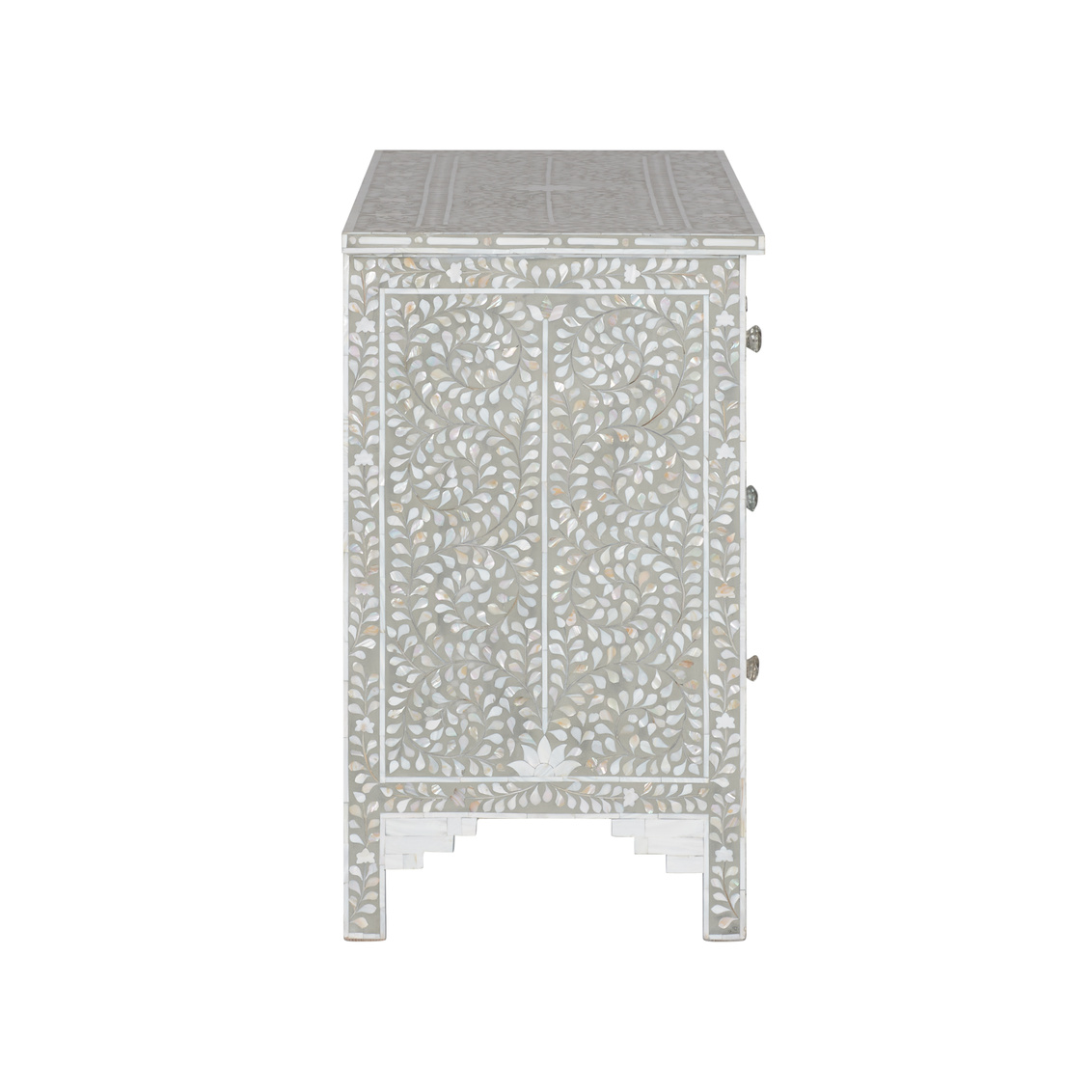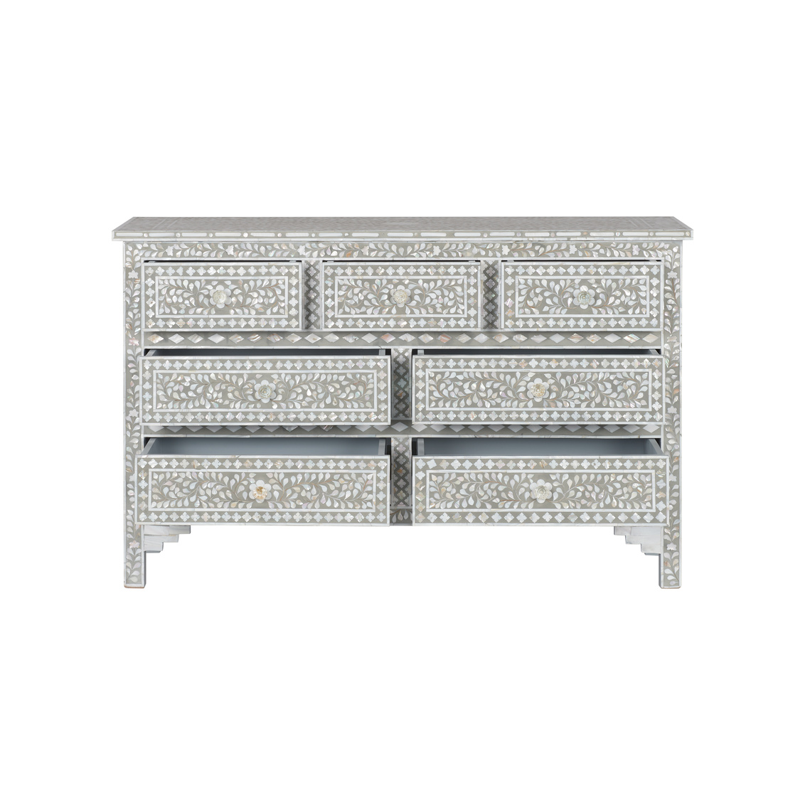 A timeless classic, this gray and white mother of pearl inlaid chest features a refined classic pattern and seven spacious drawers. Its elegant silhouette and intricate craftsmanship make it a standout piece for any room.
