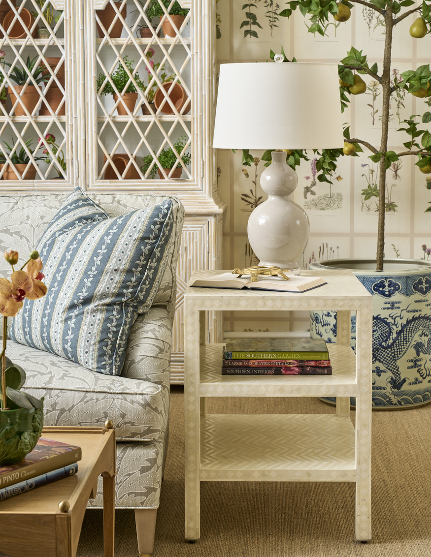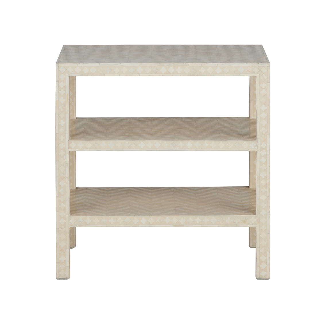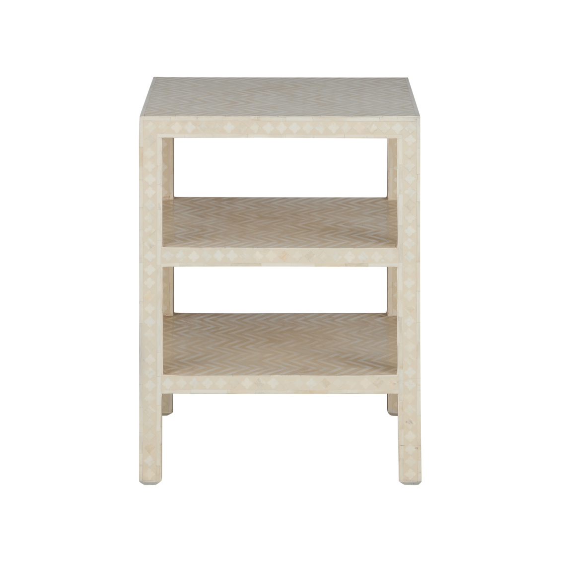 This striking side table features three open shelves and is beautifully inlaid with a chevron design. Both functional and decorative, it’s perfect for a lamp, displaying books, plants, or curated accents.