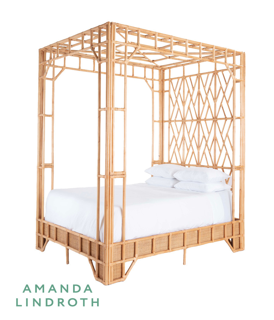 Amanda says, "Go tall or go home." This spectacular queen bed is the Grande Dame of her collection – a true statement piece. She designed her Paradise Bed with a lofty 8.5-foot canopy for maximum drama and romance. The fabulous fretwork frame is handcrafted of naturally strong pole rattan. Unlike vintage canopy beds requiring a separate interior frame to hold your mattress, ours includes teak slats to accommodate a mattress. Recommended weight limit for bed is 550lbs.