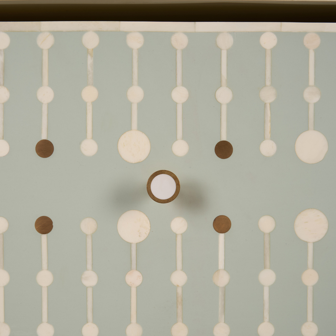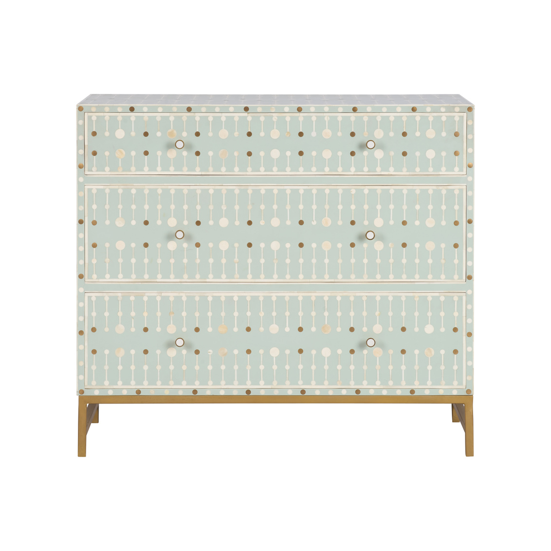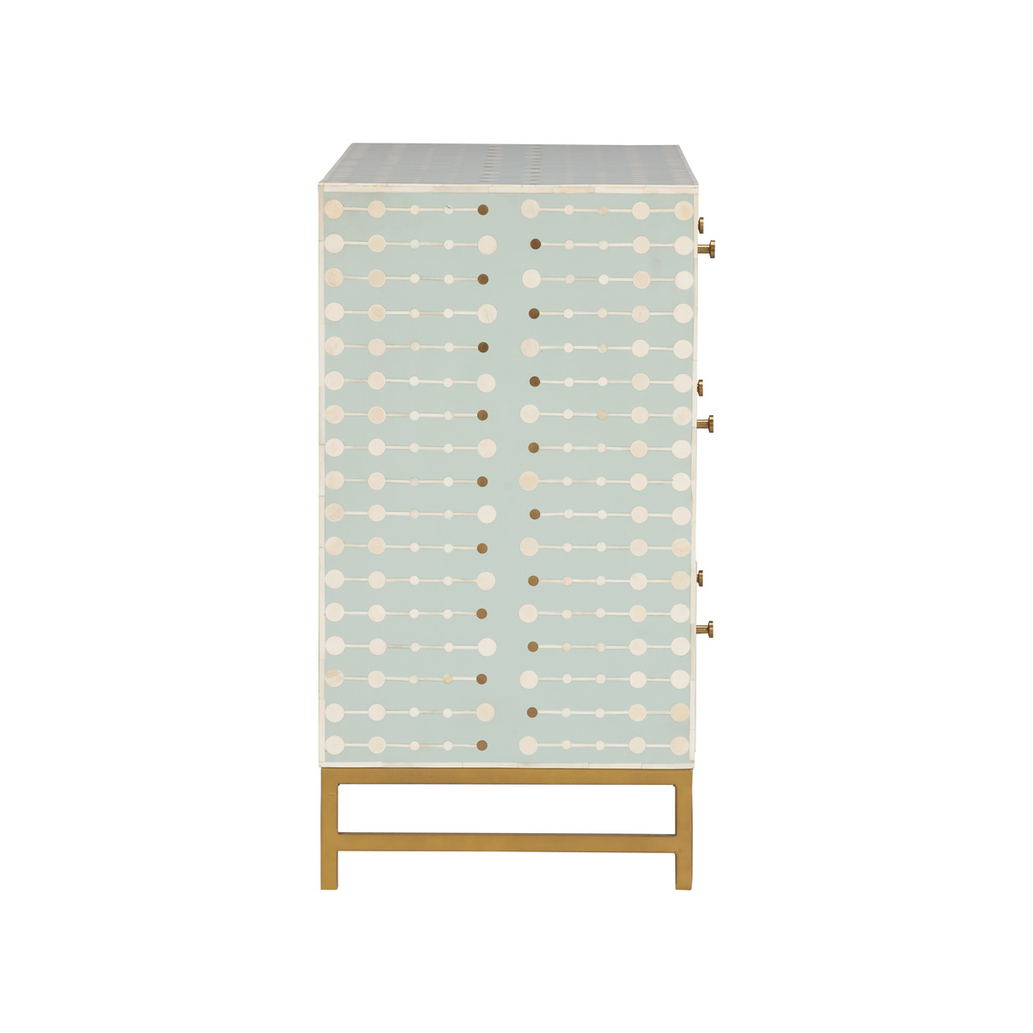 The Knox Chest showcases exquisite craftsmanship through its intricate bone inlay design set against a soft sky-blue backdrop. Accented with brass hardware and a sleek brass base, this chest exudes refined artistry and modern elegance. Each piece is meticulously handcrafted, creating a timeless statement for bedrooms, entryways, or living spaces. The geometric pattern and subtle contrast bring texture, depth, and sophistication to any interior.