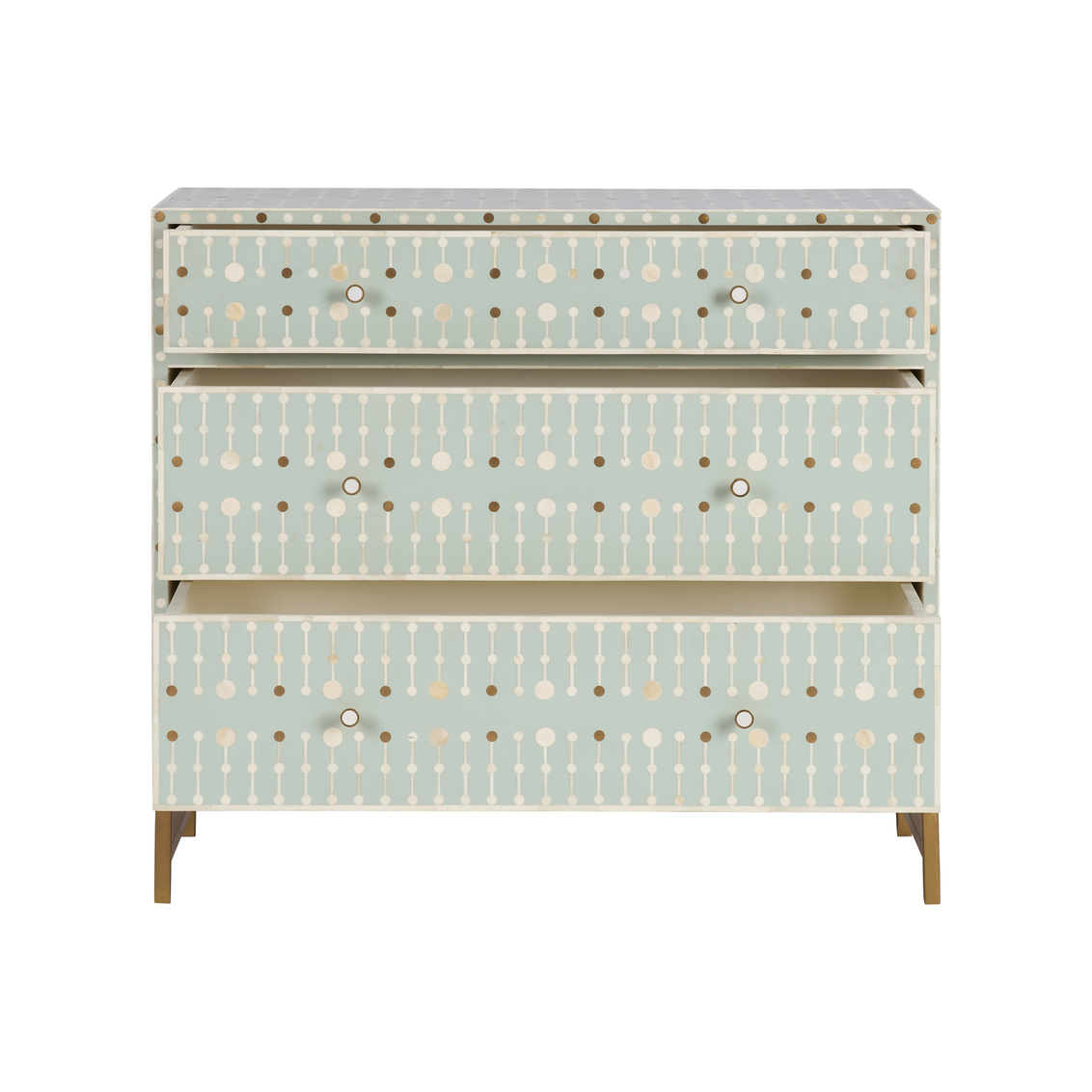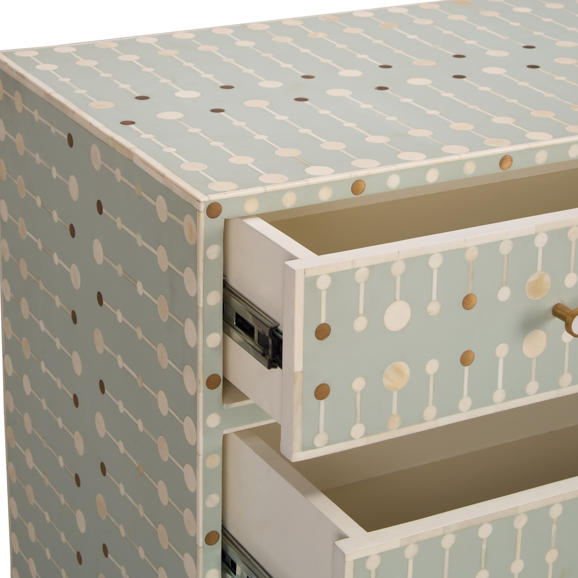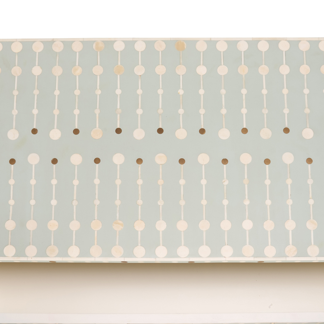 The Knox Chest showcases exquisite craftsmanship through its intricate bone inlay design set against a soft sky-blue backdrop. Accented with brass hardware and a sleek brass base, this chest exudes refined artistry and modern elegance. Each piece is meticulously handcrafted, creating a timeless statement for bedrooms, entryways, or living spaces. The geometric pattern and subtle contrast bring texture, depth, and sophistication to any interior.