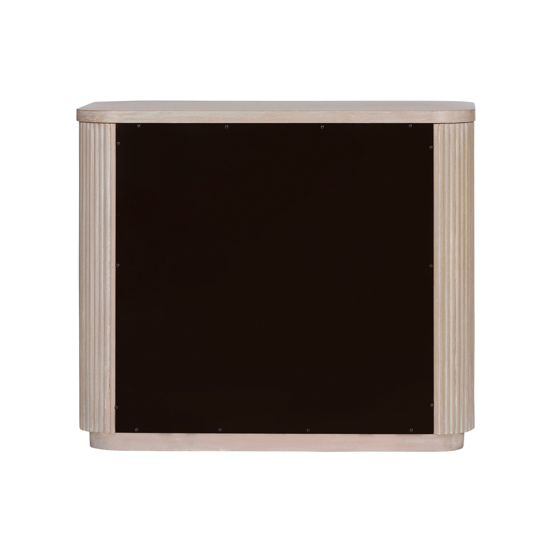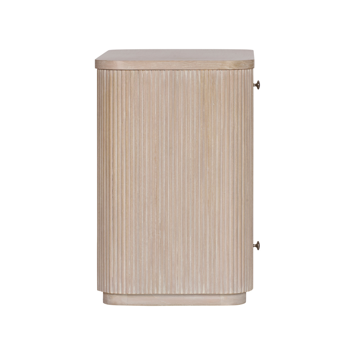 The Wes Side Table features a clean, contemporary design enhanced by vertical reeded detailing and soft rounded corners. Crafted with a light wood finish, it offers both style and function with an open center shelf and two drawers for storage. Subtle metal knobs complete the refined look, making it perfect for bedrooms or living spaces. Elegant and understated, the Wes Side Table brings modern texture and timeless appeal to any interior.