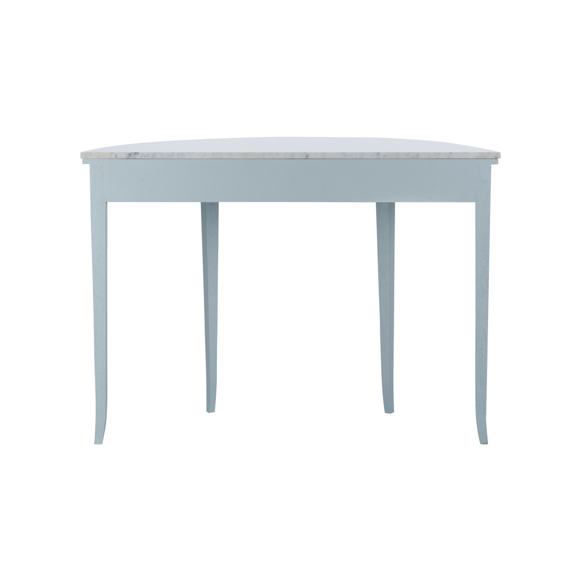 The Brussels Demilune in pale blue captures timeless European elegance with a soft modern touch. Its graceful half-moon silhouette, slender tapered legs, and smooth marble top create a sophisticated balance of form and texture. Perfect for entryways, hallways, or living spaces, this piece offers refined charm and functional beauty. The pale blue cerused oak finish enhances its sculptural appeal, bringing a serene, airy elegance to any interior. Designed by Jamie Merida.