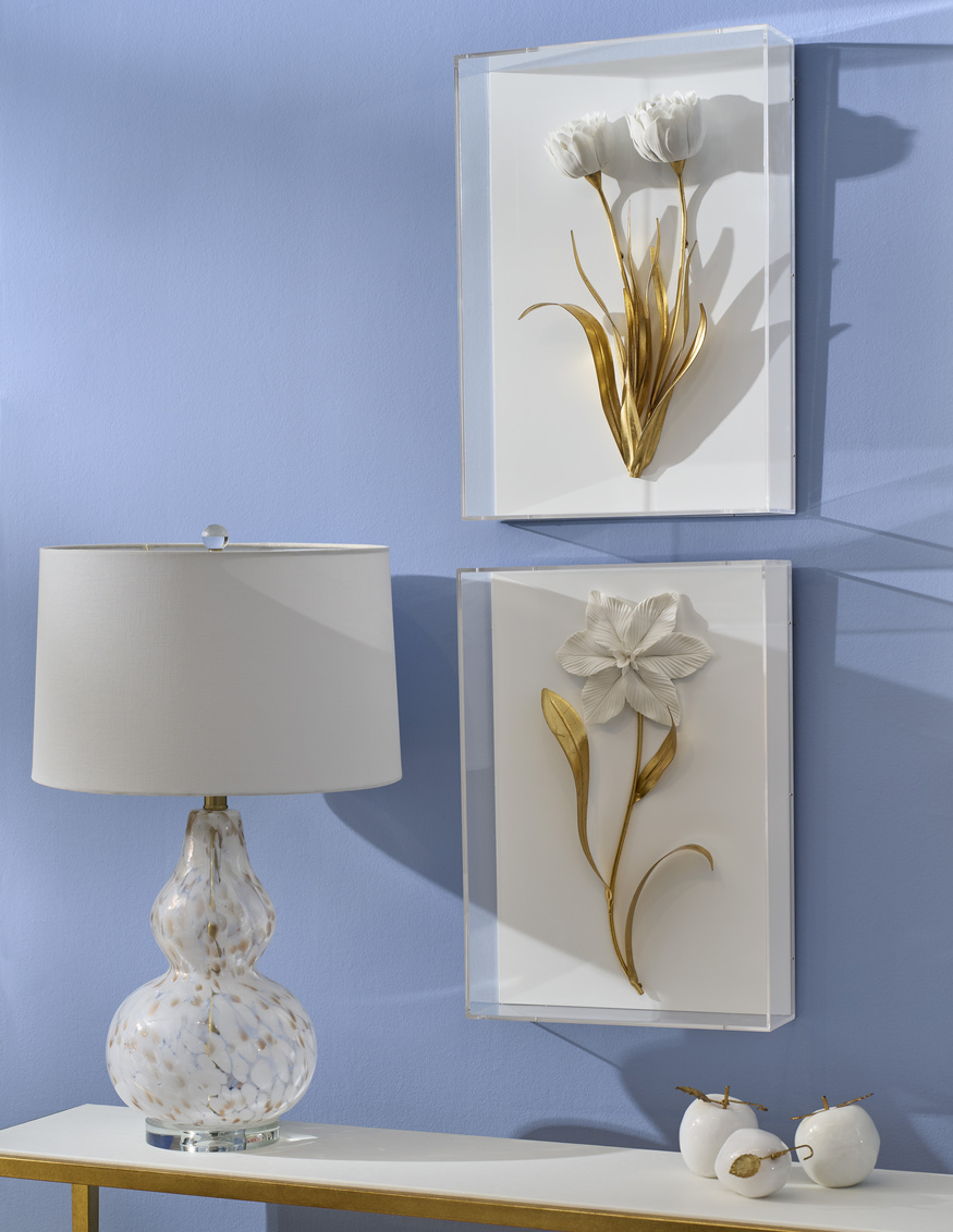 The Emilio Table Lamp exudes modern elegance with its sculptural gourd-shaped glass base, featuring a soft swirl of ivory and amber tones for a warm, organic look. Resting on a clear crystal base and paired with a crisp white drum shade, this lamp adds a sophisticated glow to any room—perfect for contemporary, coastal, or transitional interiors.