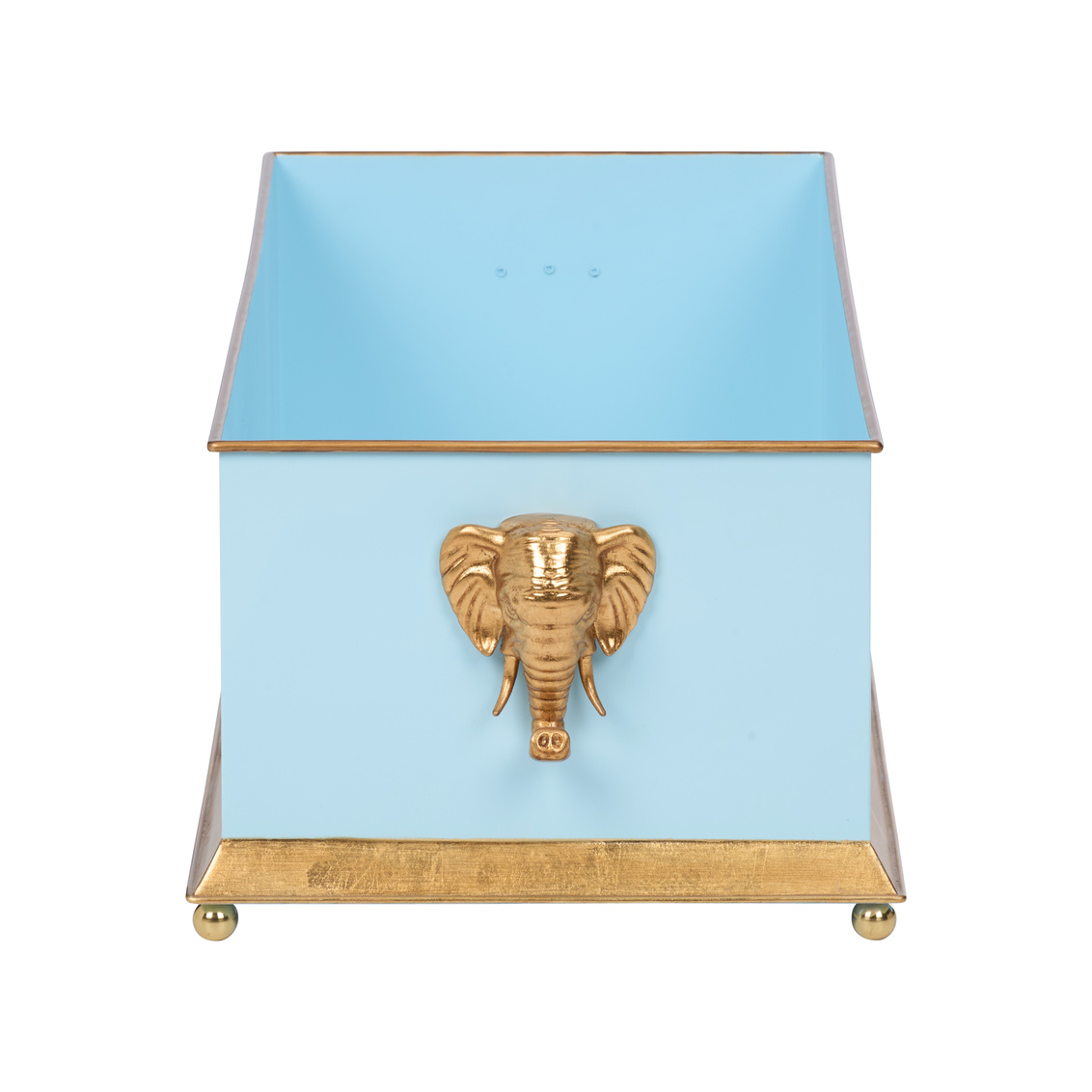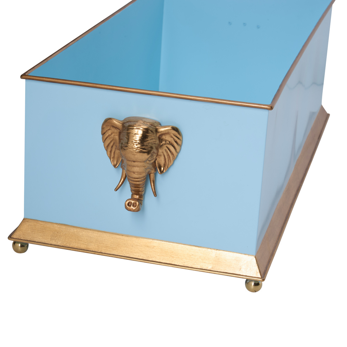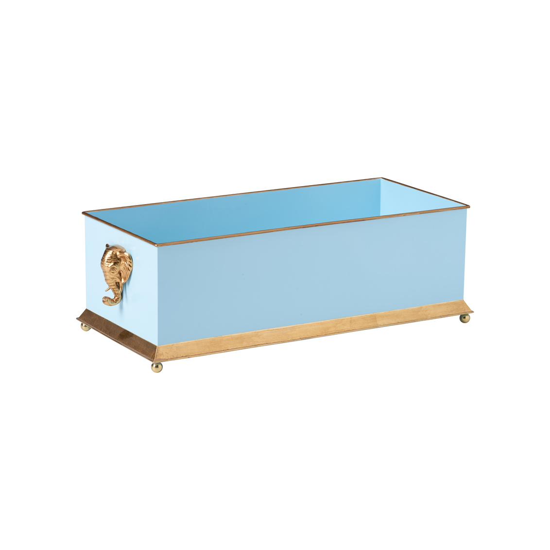 Elevate your greenery with the Elephant Head Planter. Available in black, white, and blue, this elegant metal planter features refined gold accents and sculptural elephant head handles for a touch of whimsy and sophistication. Designed by Bill Cain.