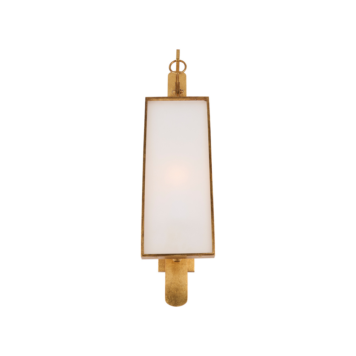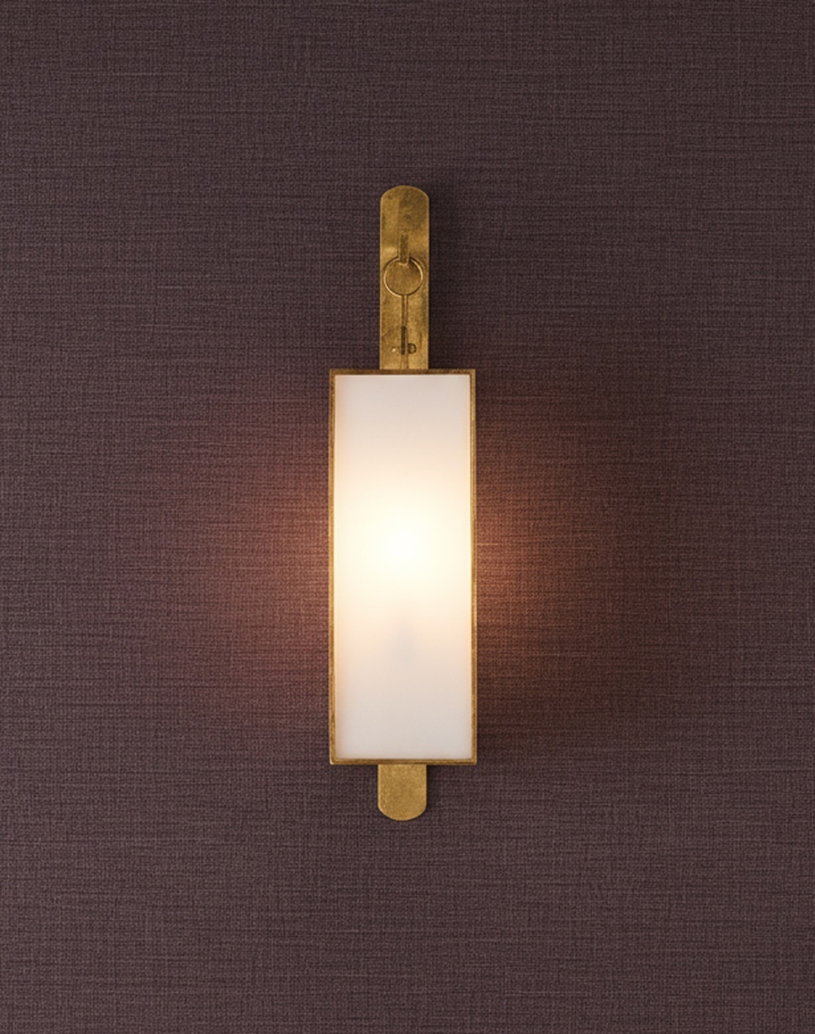 Gold leaf wall electrified sconce with a rectangular tempered glass panel to add warmth and glow to a room.