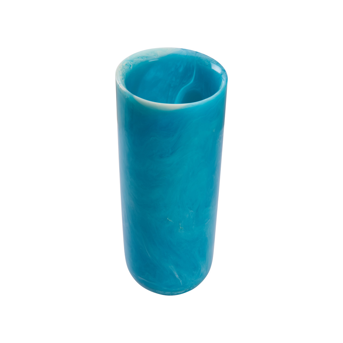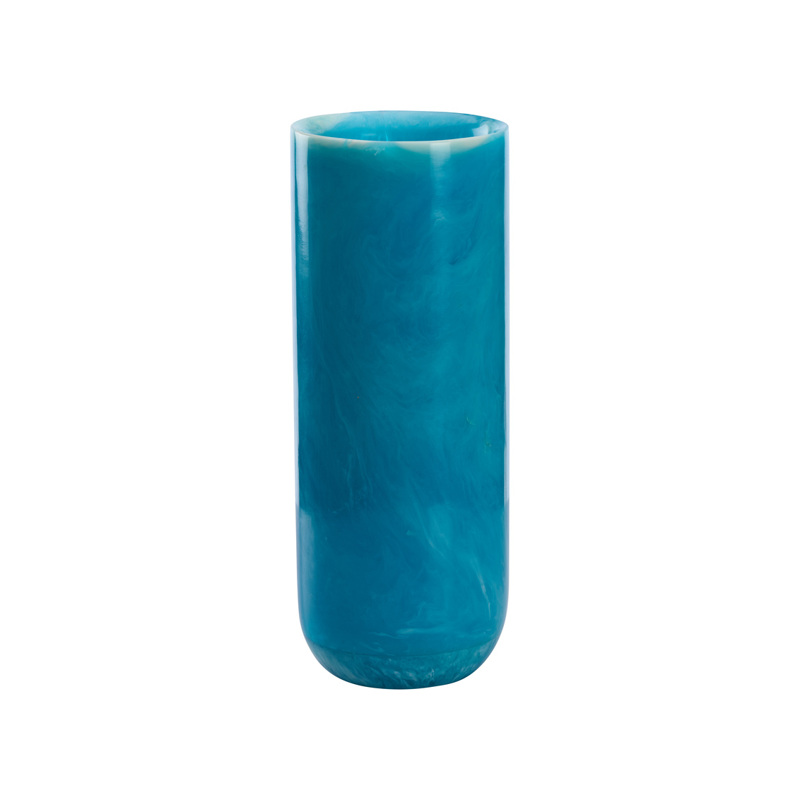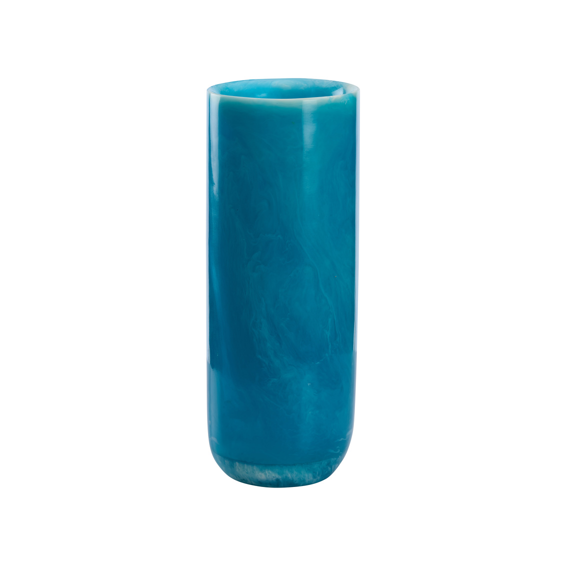 Modern artistry in motion. This vase is part of three marbled blue resin cylinder vases showcases fluid patterns and sleek silhouettes. Varying in height, they create a stunning display together or apart.