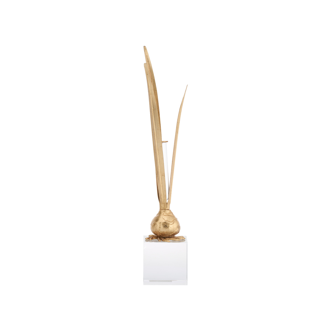 This unique piece features a delicate bud vase nestled a top of a bed of shimmering crystal, adorned with meticulously crafted gold leaf bulb that playfully conceal the vase, adding a touch of whimsical charm to any setting. The Bulb Gold Leaf Vase itself is a study in refined simplicity, offering a slender silhouette that gracefully showcases your favorite blooms. Its transparent crystal base provides a stunning foundation, allowing light to dance and refract, enha