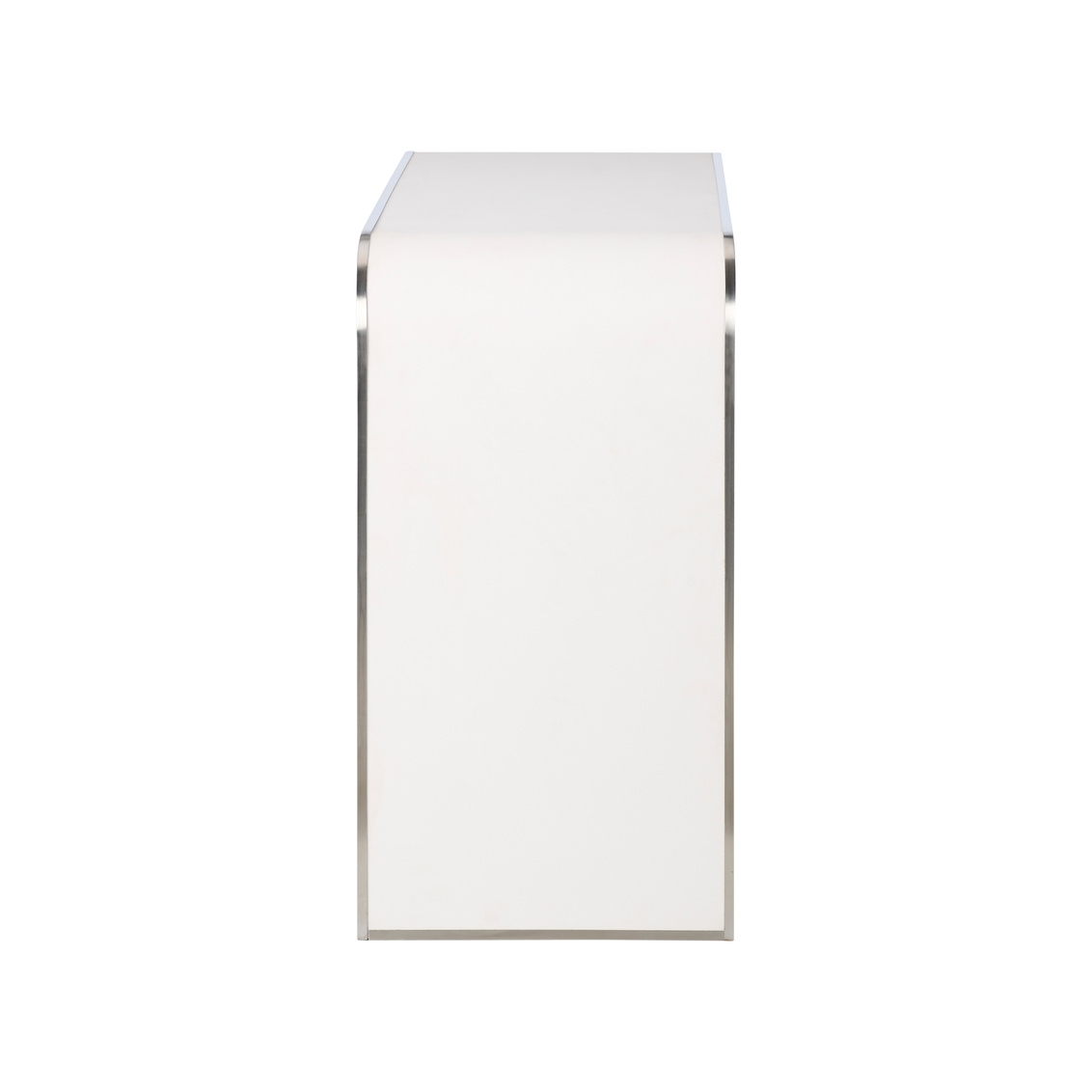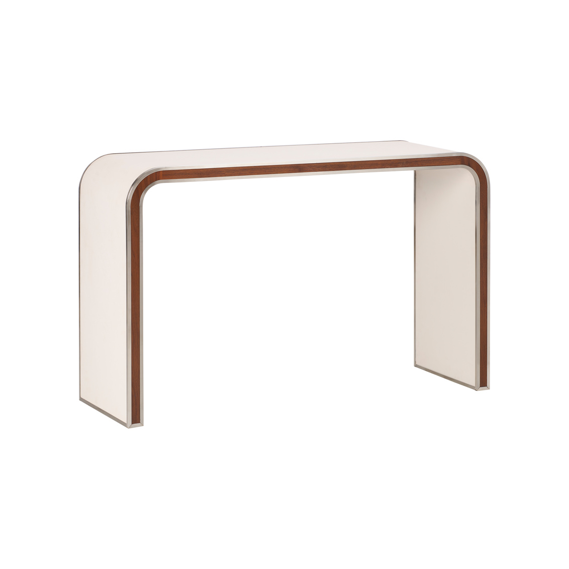 The Arden Console Table showcases bold modern style with its sleek waterfall silhouette and bright white leather finish. Trimmed in warm walnut and brushed nickel accents, it’s a striking piece that elevates any entryway or living space with sophisticated contrast and clean design.