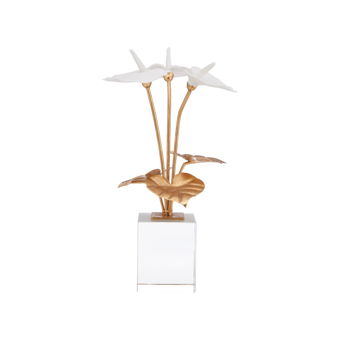The Small Anthuriums on Stand is a graceful nod to the opulent artistry of Fabergé antiques. Featuring hand-crafted white blooms with gold-leafed stems and heart-shaped leaves, this sculptural piece rests elegantly on a clear crystal base. Delicate yet luxurious, it captures the timeless beauty of nature through fine detailing and refined materials. A stunning decorative accent, it adds a touch of sophistication and heirloom charm to any tabletop or display. Designed by Jamie Merida.