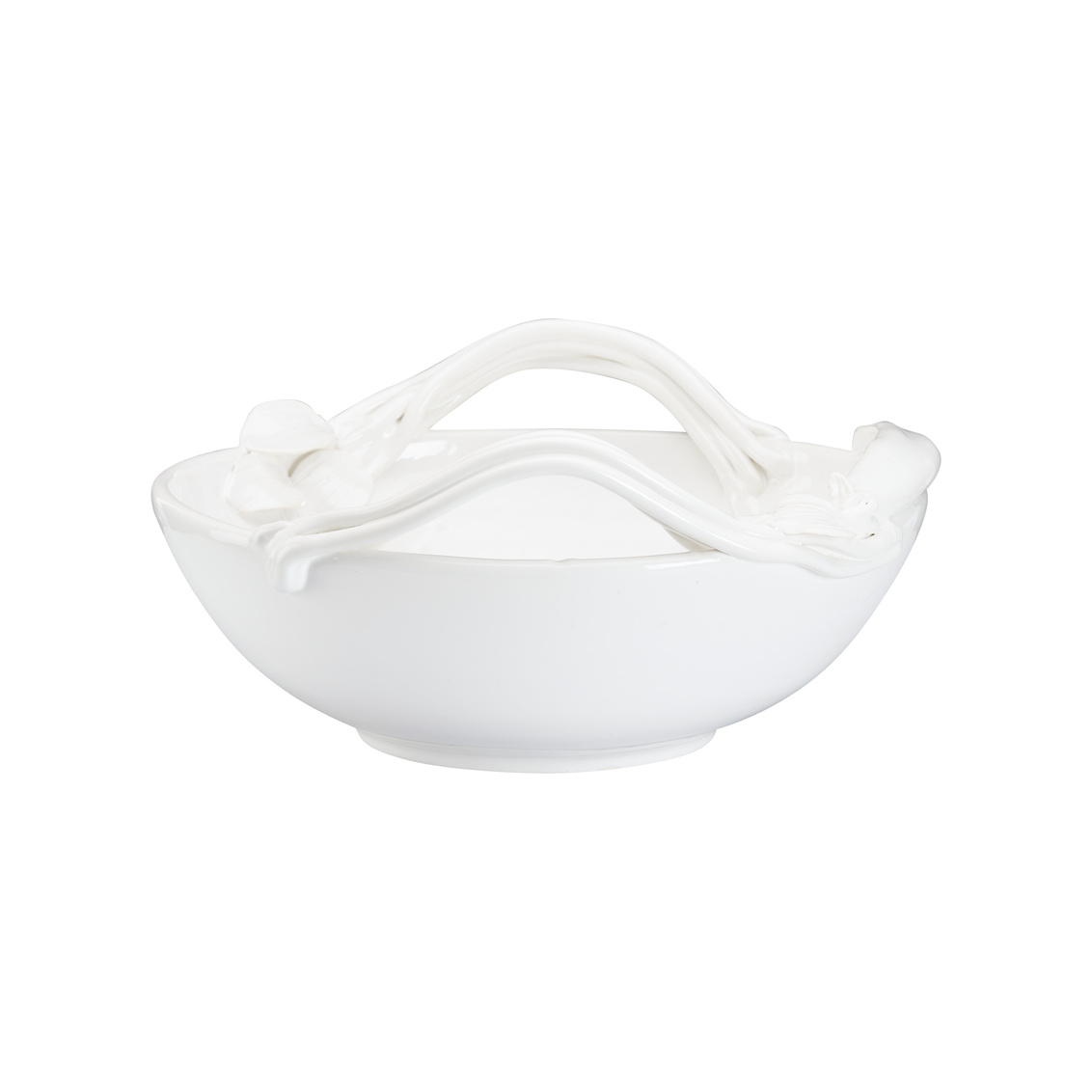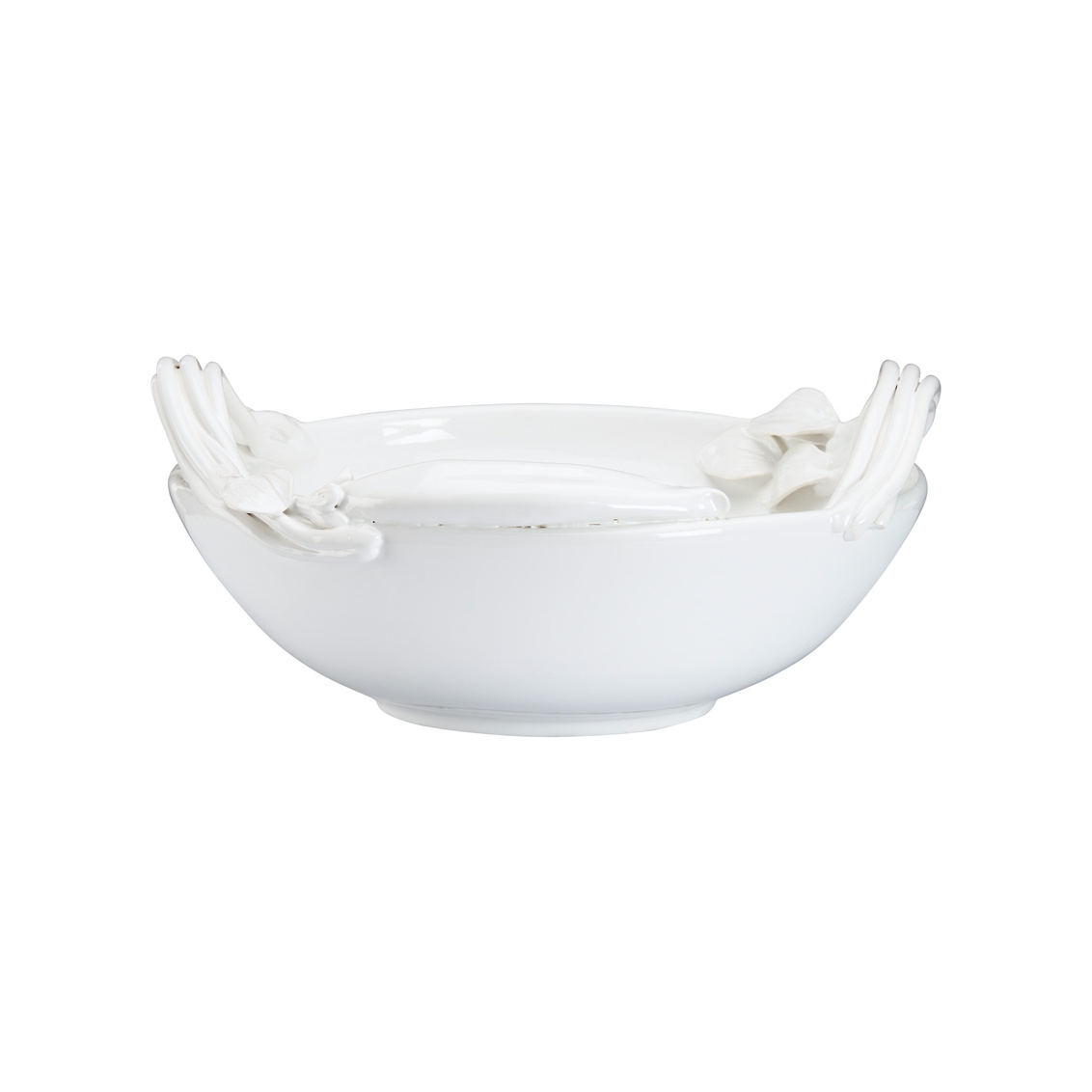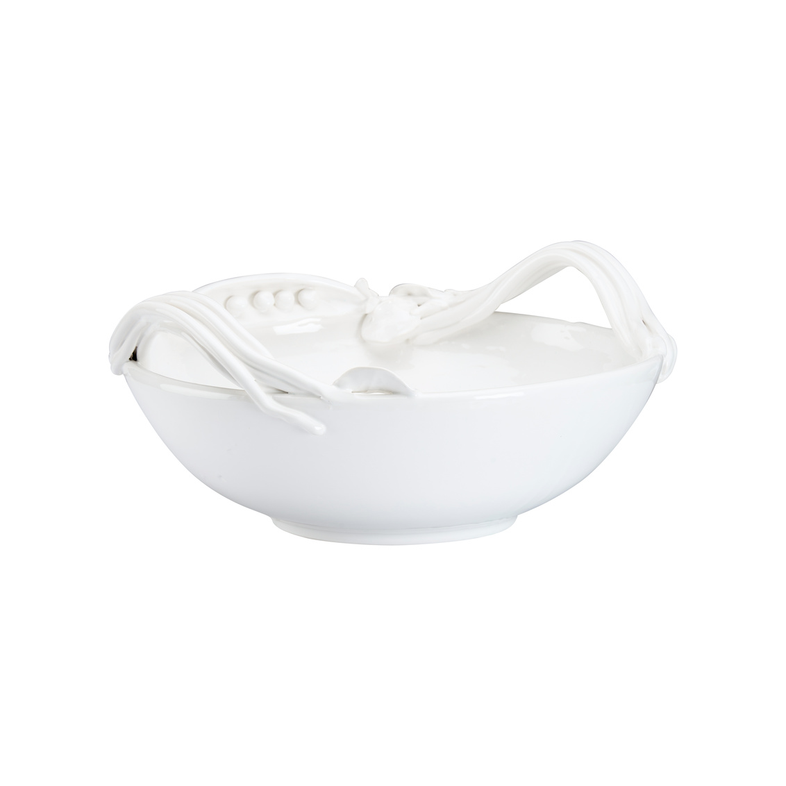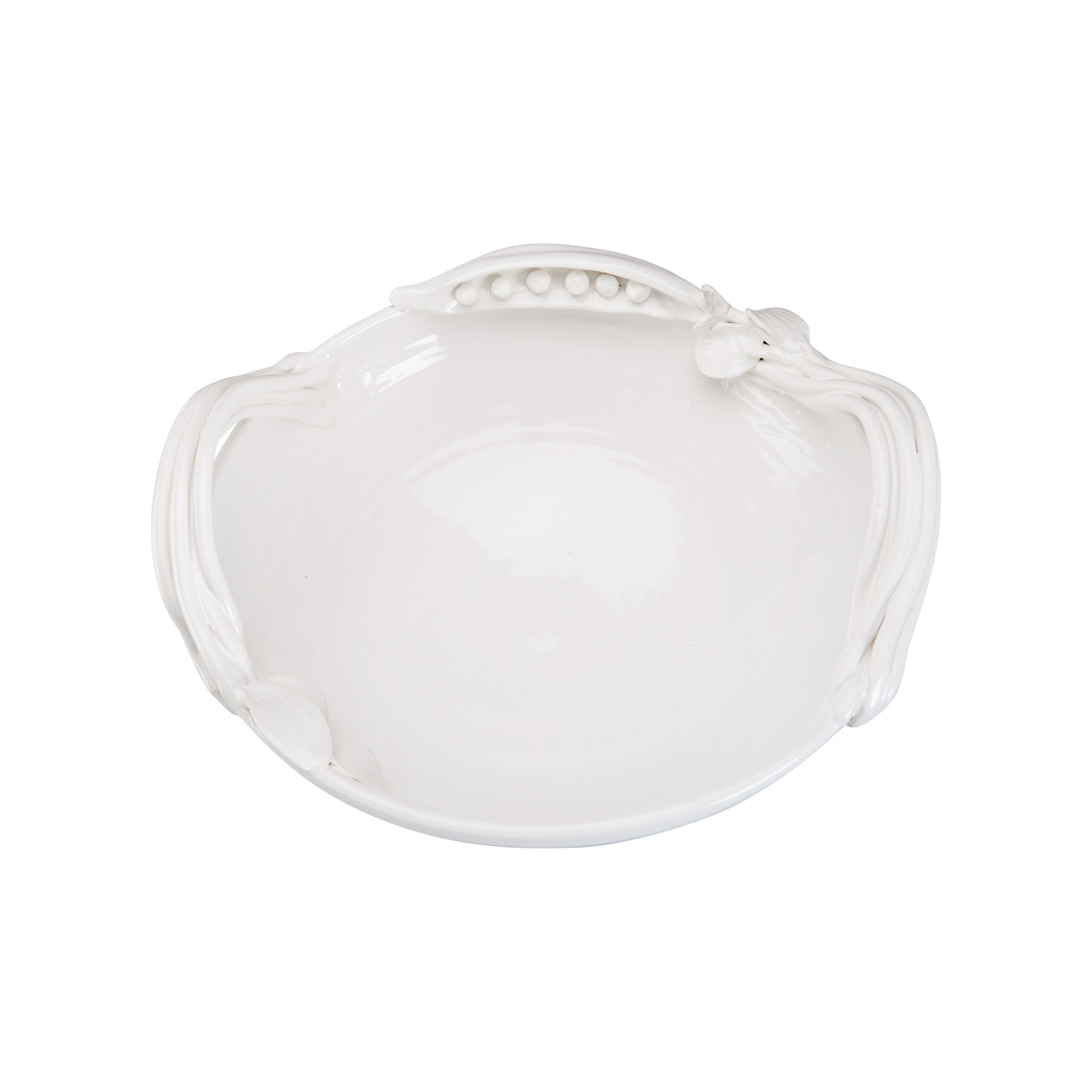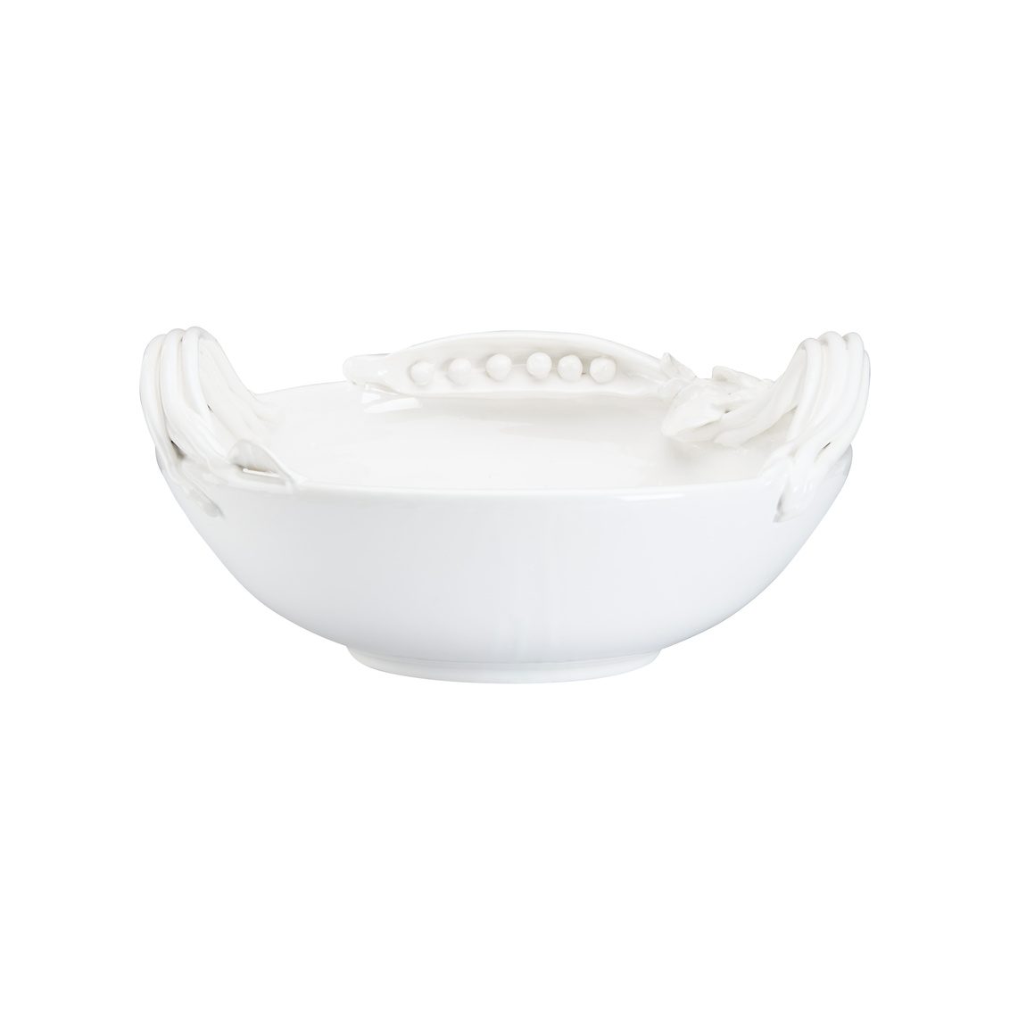 The Pisello Bowl captures the beauty of Italian craftsmanship with its refined yet playful design. Made in Italy, this elegant ceramic bowl features delicate handmade peapods that gracefully adorn the rim, complemented by sculpted handles that flow seamlessly from the form. Finished in a creamy white glaze, it embodies timeless sophistication and organic charm.