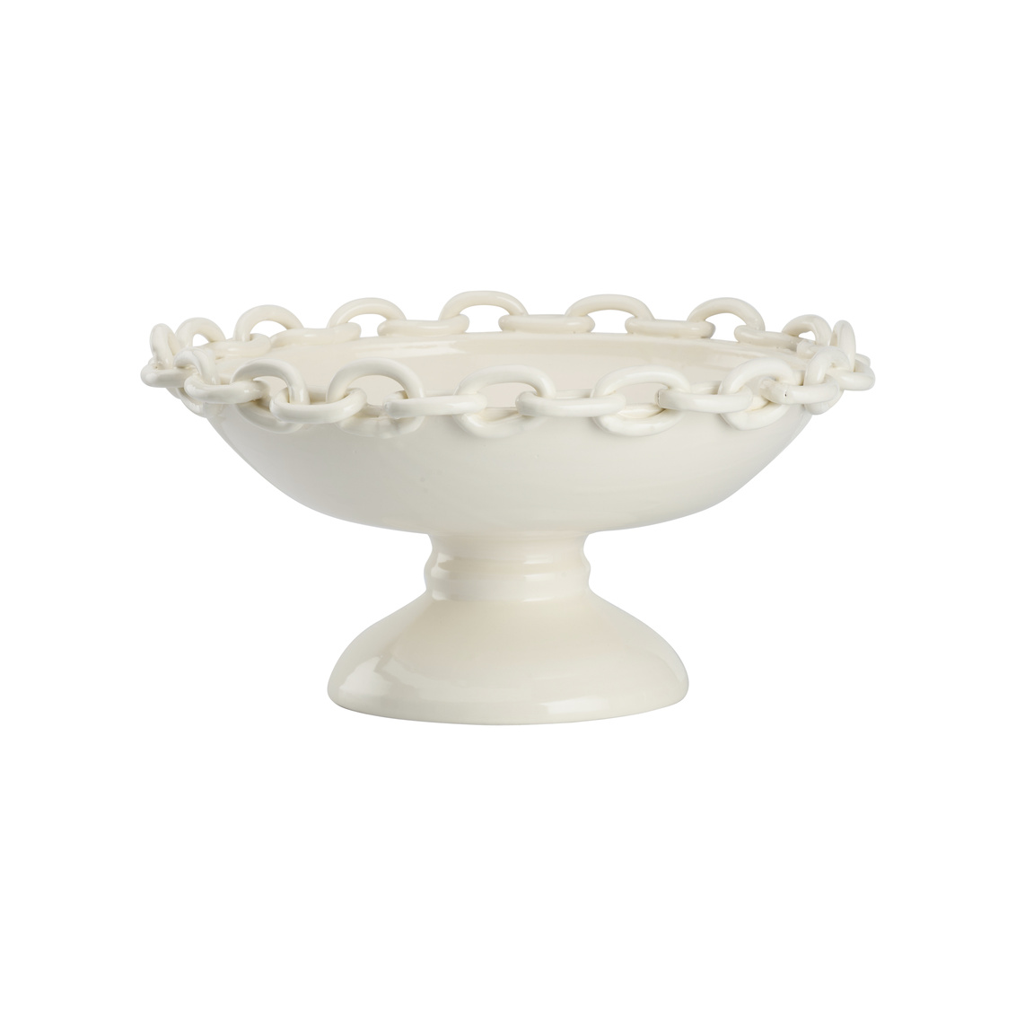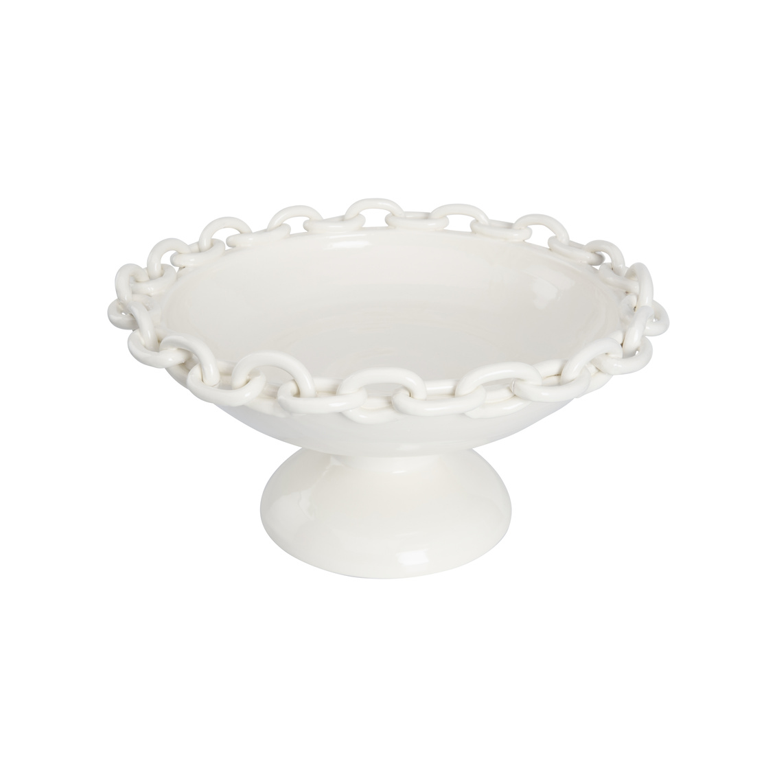 The Catena Footed Bowl exemplifies timeless elegance and refined craftsmanship. Made in Italy, this handmade ceramic bowl features a graceful footed base and a creamy white finish that exudes sophistication. The design is beautifully accented with a chain-link trim, adding a distinctive sculptural detail that captures the essence of artisanal luxury.