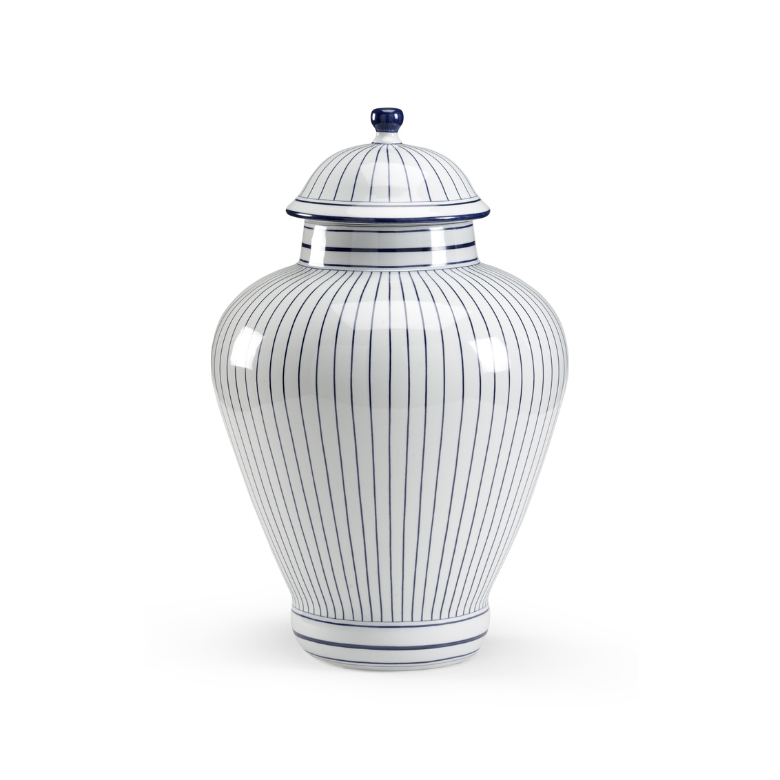 Add this classic blue and white glazed porcelain urn to your home. This 23" hand decorated accent features blue stripes... Show more