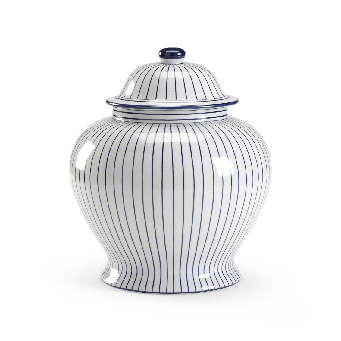 Add this classic blue and white glazed porcelain urn to your home. This 14.5" hand decorated accent features blue stripes and a removable lid. A great addition to create visual interest on tabletops or shelves in any decorative style. May be paired with our 19" castle urn.
