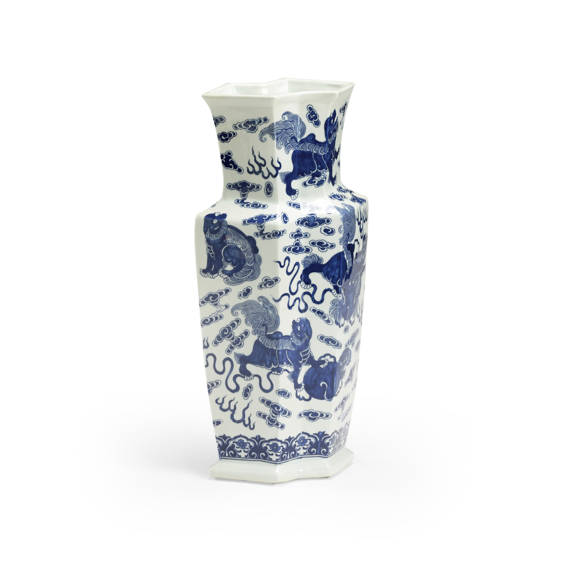 White glazed ceramic with hand-painted blue foo dog designs.