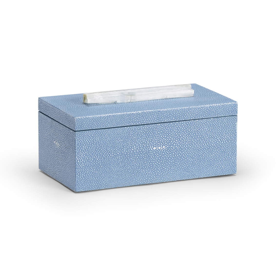 Update your tabletop with our stunning Durham Box. This light blue shagreen covered wooden box features a dazzling natural rock crystal handle. It has a velvet lined jewelry tray insert for storing your personal baubles. (Available in other sizes: search Durham)