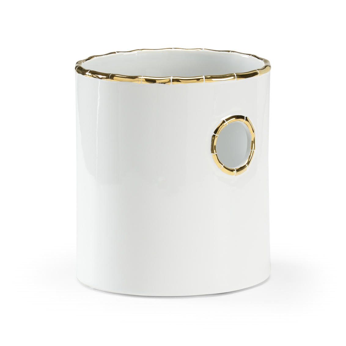 In need of an ideal way to add greenery to your decor? Bamboo Cachepot is a lovely way to get the job done. This elegant planter is crafted in white glazed porcelain with metallic gold trim inspired by the look of bamboo. With its neutral color palette and size, this 9" pot fits perfectly on any even surface throughout any design. Designed by Bradshaw Orrell.