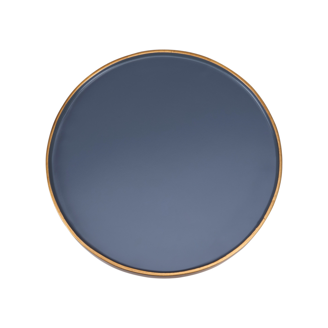 Antique gray wash finished wood with clear  glass top and antique gold edging, designed by Bradshaw Orrell.