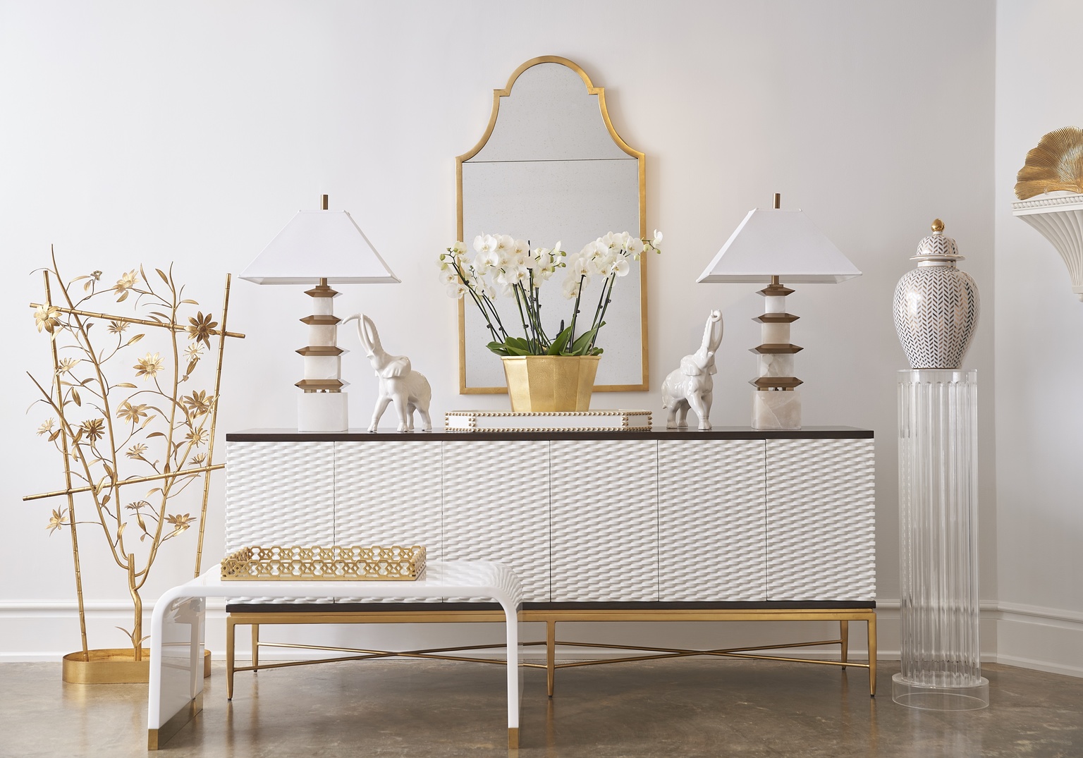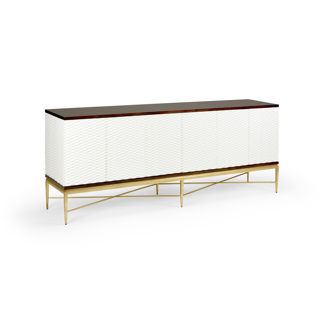 Elevate your dining room storage with this handsome sideboard. Featuring walnut veneered wood with white door fronts in a woven design pattern. Its six doors are touch release for easier access. James Sideboard is the perfect option for storing your serving pieces in your dining room or board games in your entertainment area. Not intended for clothes storage.