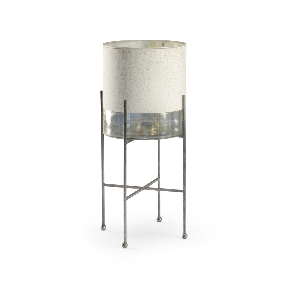 Large glass candleholder with rusticated white finish and silver banding. Antiqued iron support.