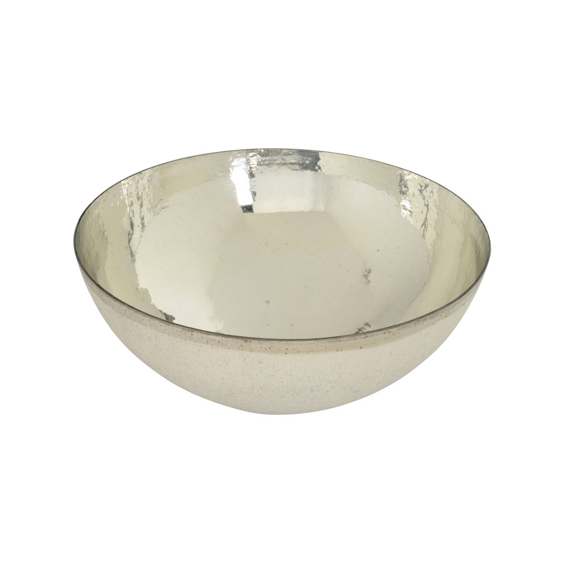 Medium rusticated white glass bowl with nickel trim and nickel finish on inside. For decorative use only, not safe on food.