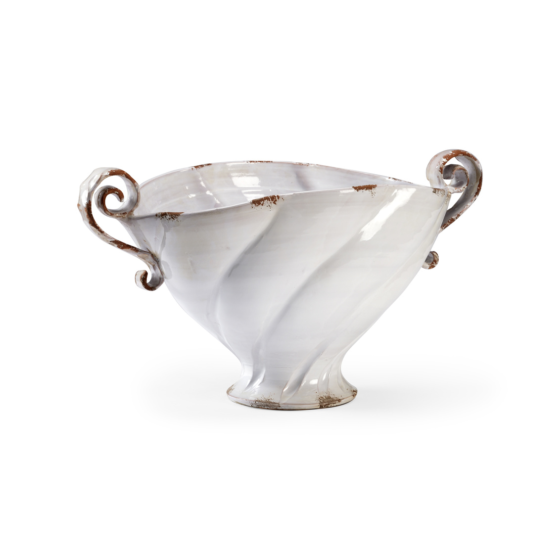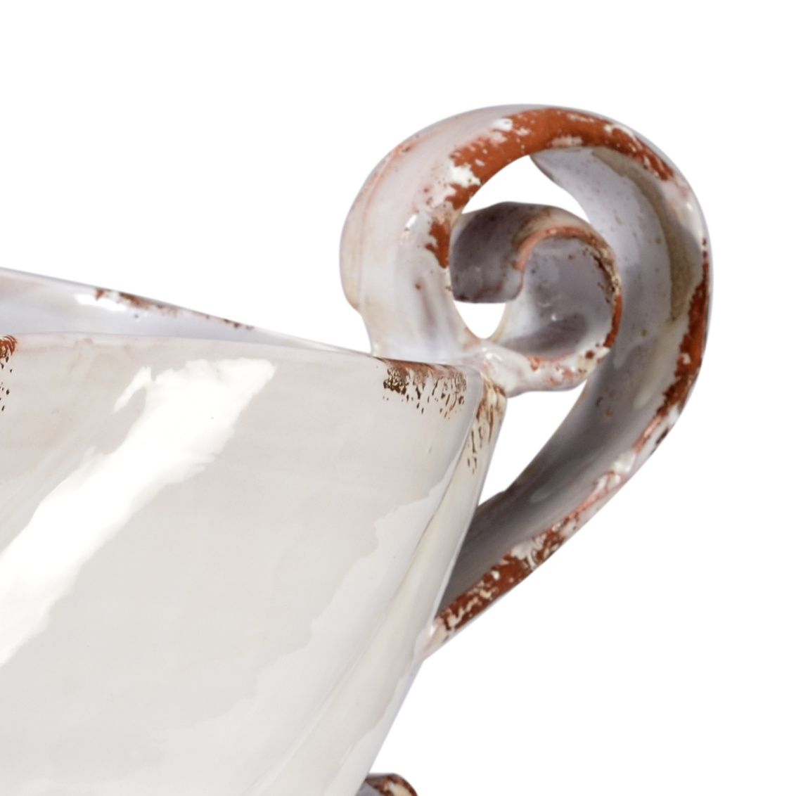 Tuscan inspired ceramic bowl with handles in an hand finished antique white distressed finish.