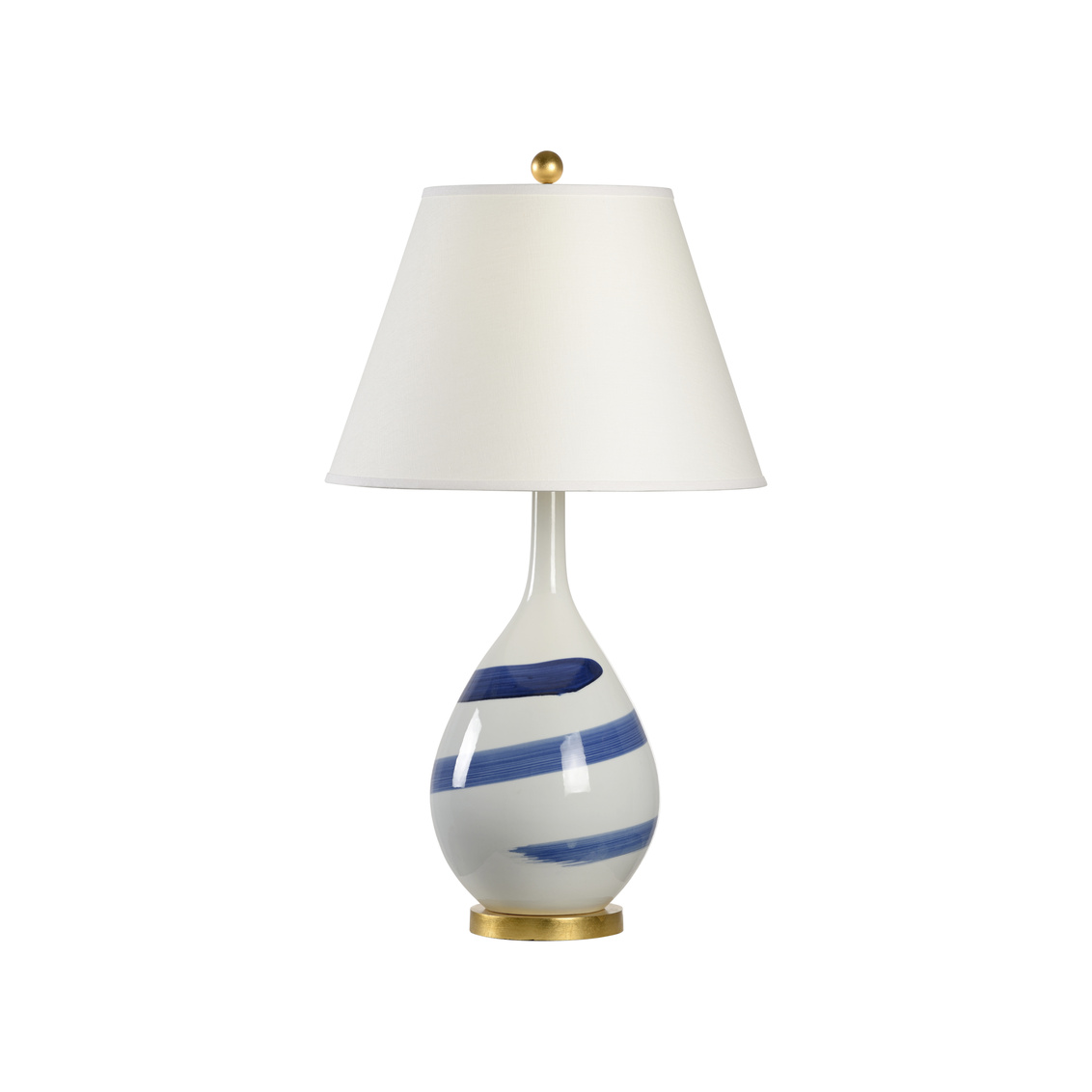 Add movement and beauty to your home with the Blue Swirl Lamp. Featuring a curved silhouette with an elongated neck, this white glazed porcelain vase has a hand painted blue swirl brushstroke. The base and finial are finished in antique gold leaf. An off white tapered linen shade helps to achieve a transitional design pefect for a bedroom nightstand or dresser.