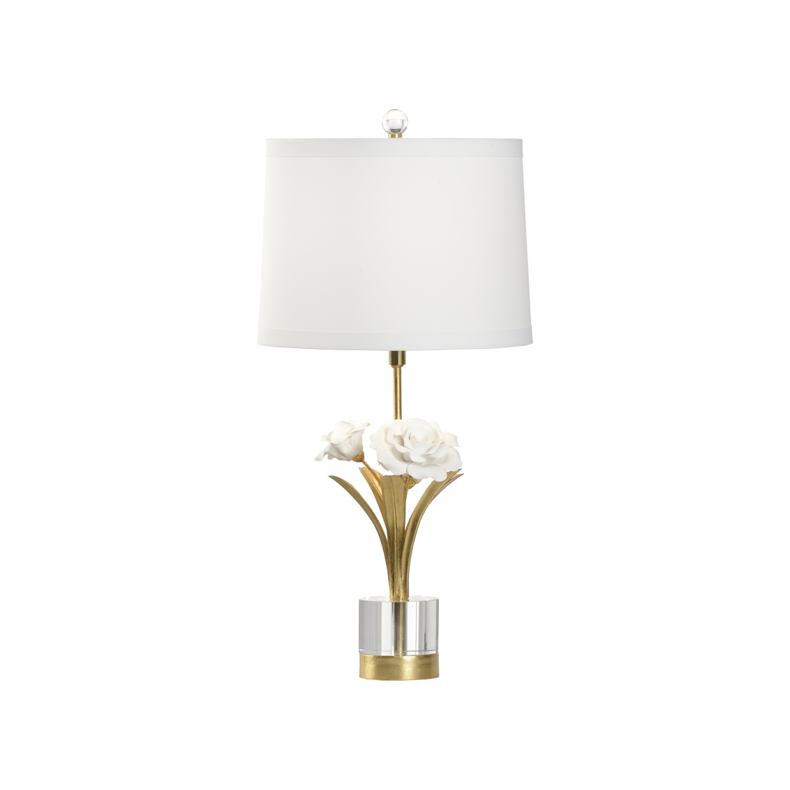 Hand formed white porcelain roses on gold leaf iron stems with a crystal mount.