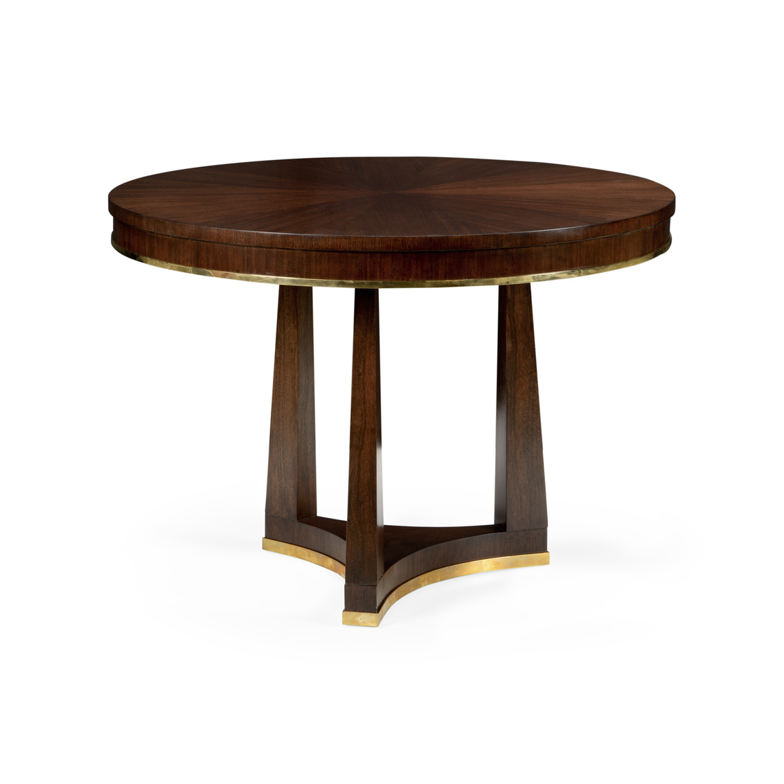 Entry table made from gmelina solids with walnut quartered veneer and brass trim. Can be used as a small dining table for those with limited space.